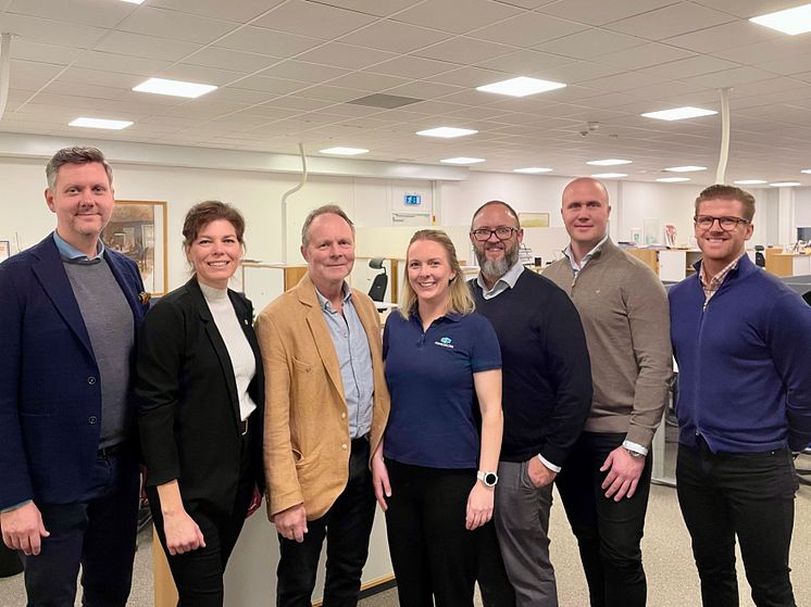 Mikael Löfberg tillsammans med Cenita och Stefan Johansson (Klässbols Linneväveri), Anna Holmgren och Mikael Einarsson (Finnebäcks) och Andreas och Adam Fransson (Lillängshamnens Fiskrökeri).