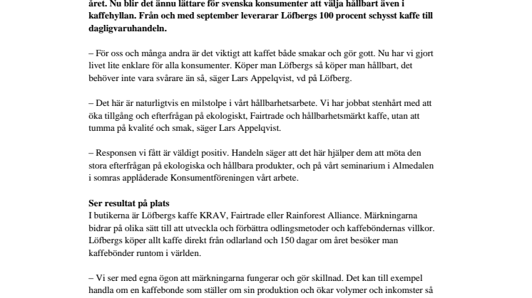 - För oss och många andra är det viktigt att kaffet både smakar och gör gott. Nu har vi gjort livet lite enklare för alla konsumenter. Köper man Löfbergs så köper man hållbart, det behöver inte vara svårare än så, säger Lars Appelqvist, vd på Löfberg.
