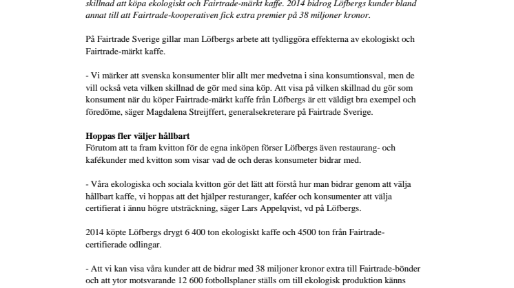 Med ekologiska och sociala kvitton vill Löfbergs visa landets kaffeälskare att det gör skillnad att köpa ekologiskt och Fairtrade-märkt kaffe. 2014 bidrog Löfbergs kunder bland annat till att Fairtrade-kooperativen fick extra premier på 38 miljoner kronor.