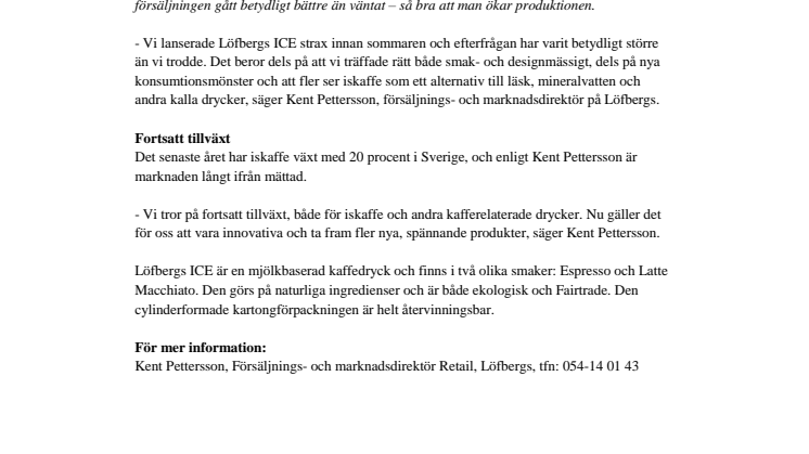 - Vi lanserade Löfbergs ICE strax innan sommaren och efterfrågan har varit betydligt större än vi trodde. Det beror dels på att vi träffade rätt både smak- och designmässigt, dels på nya konsumtionsmönster och att fler ser iskaffe som ett alternativ till läsk, mineralvatten och andra kalla drycker, säger Kent Pettersson, försäljnings- och marknadsdirektör på Löfbergs.