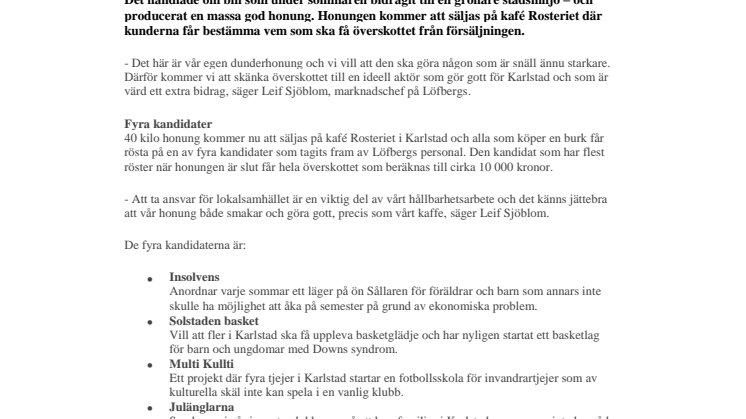 - Det här är vår egen dunderhonung och vi vill att den ska göra någon som är snäll ännu starkare. Därför kommer vi att skänka överskottet till en ideell aktör som gör gott för Karlstad och som är värd ett extra bidrag, säger Leif Sjöblom, marknadschef på Löfbergs.