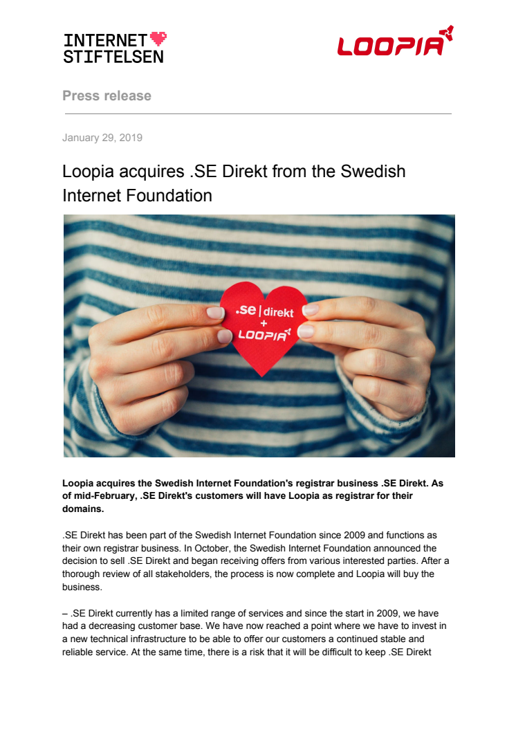 Loopia acquires the Swedish Internet Foundation's registrar business .SE Direkt. As of mid-February, .SE Direkt's customers will have Loopia as registrar for their domains.