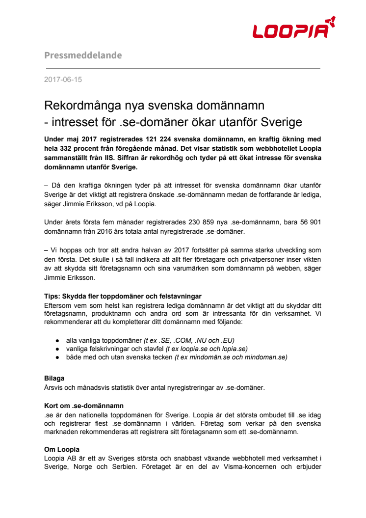 Under maj 2017 registrerades 121 224 svenska domännamn, en kraftig ökning med hela 332 procent från föregående månad. Det visar statistik som webbhotellet Loopia sammanställt från IIS. Siffran är rekordhög och tyder på ett ökat intresse för svenska domännamn utanför Sverige.