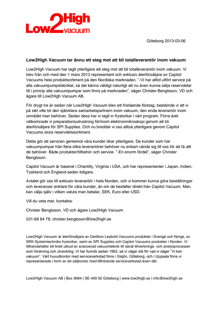 Low2High Vacuum har tagit ytterligare ett steg mot att bli totalleverantör inom vakuum. Vi blev från och med den 1 mars 2013 representant och exklusiv återförsäljare av Capitol Vacuums hela produktsortiment på den Nordiska marknaden.