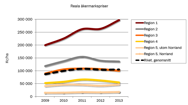 Årets prisförändring skiljer sig mellan de olika regionerna där priserna på de bördigaste jordarna uppvisar en ökning med hela 13 procent. Anmärkningsvärt är att priserna gått ner 12 procent i region 4 medan priserna i den mindre bördiga region 5 har stigit 10 procent. Åkermark i dessa regioner, med mindre bördig mark, är inte alltid anledningen till ett fastighetsköp. I försäljningen kan exempelvis skogsmark och byggnader ingå, vilket kan medföra att just åkermarken ”följer med i köpet”. Att Sverige är ett avlångt land vittnar inte minst åkermarkspriserna om. I Skåne kan priset uppgå till så mycket som cirka 420 000 kr/hektar medan viss åkermark i Norra Sverige betingar ett värde mindre än 20 000 kr/hektar.