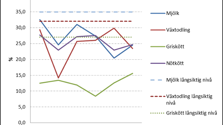 Griskötts- och mjölkföretagen håller på att ta sig upp från den sämsta lönsamheten någonsin, men det krävs uthållighet för att nå långsiktig lönsamhetsnivå. De globala utsikterna till bra sådd och god skörd ser i nuläget lovande ut, vilket pressar ned lönsamheten för växtodlingsföretagen, men extremväder någonstans kan snabbt ändra läget. Svenskt nötkött förväntas vara fortsatt eftertraktat vilket ökar möjligheten till ett bra avräkningspris vid rätt kvalité.