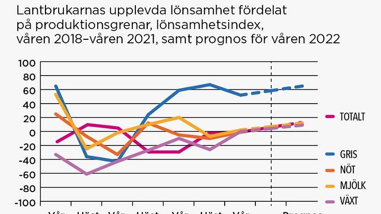 Lantbrukarna upplever att deras lönsamhet ligger på ungefär samma nivå som för ett år sedan. Störst positiv förändring syns bland växtodlarna vars lönsamhetsindex gått från minus 26 till noll. Deras prognos framåt är fortsatt positiv. Hög efterfrågan på jordbruksprodukter och att man får förhållandevis bra betalt för sina produkter är en del av grunden till resultatet.
