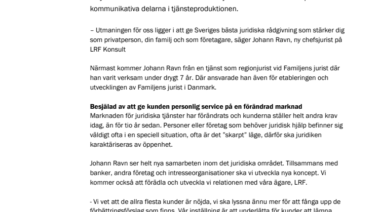 – Utmaningen för oss ligger i att ge Sveriges bästa juridiska rådgivning som stärker dig som privatperson, din familj och som företagare, säger Johann Ravn, ny chefsjurist på LRF Konsult