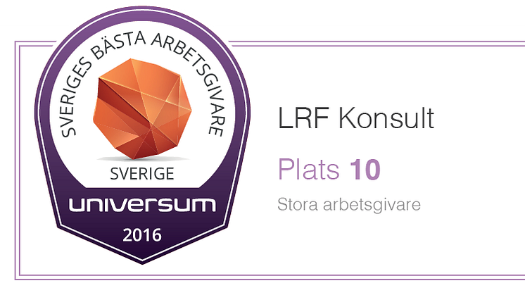 LRF Konsult är utsedd till en av Sveriges bästa arbetsgivare 2016 i Universums årliga mätning och placerar sig på topp tio. Det är de egna medarbetarna som bedömer sin arbetsgivare och LRF Konsult klättrar från plats 18 till plats 10.