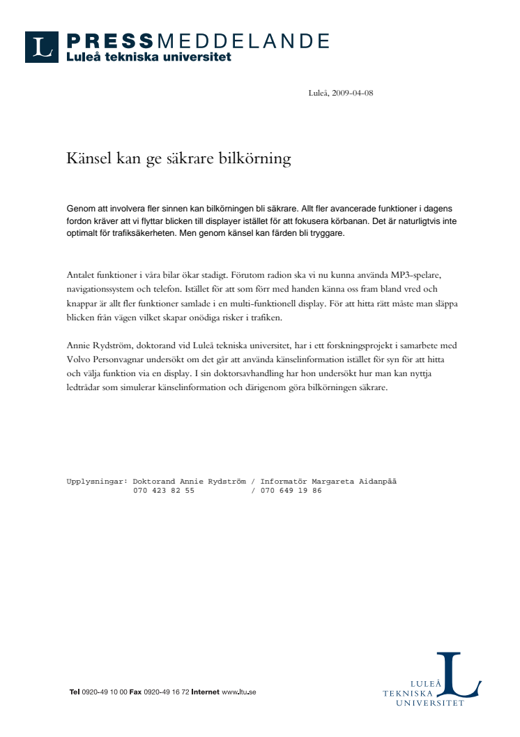 Fler sinnen kan ge säkrare bilkörning visar en doktorsavhandling vid Luleå tekniska universitet som gjorts i samarbete med Volvo Personvagnar.