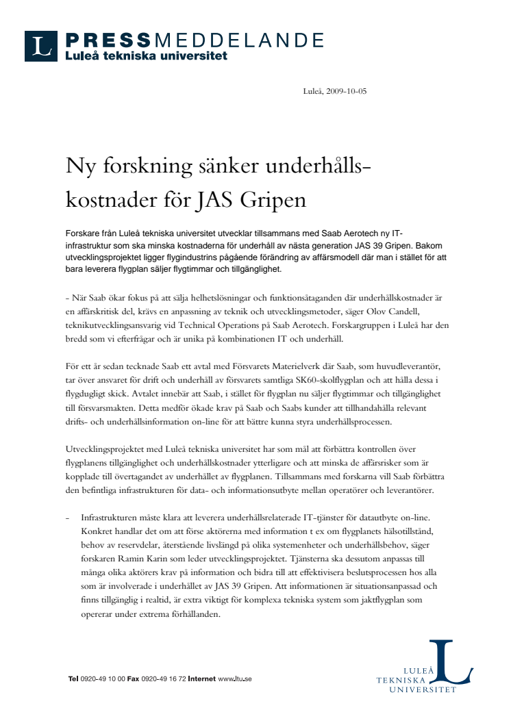 Saab Aerotech samarbetar med forskare från Luleå tekniska för att ta fram en ny IT-infrastruktur som ska minska underhållskostnaderna för nästa generation JAS Gripen.