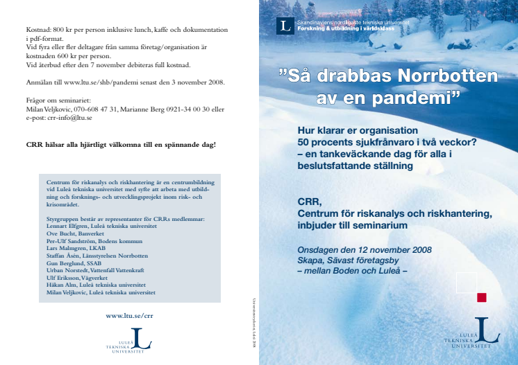 Hur drabbas socialtjänst, media, elförsörjning och basindustri när hälften av personalen är sjukskriven i två veckor? CRR - Centrum för riskanalys och riskhantering - vid Luleå tekniska universitet, arrangerar den 12 november ett seminarium om hur en världsomfattande epidemi skulle kunna slå mot Norrbotten. Målgruppen är beslutsfattare i offentlig och privat verksamhet.