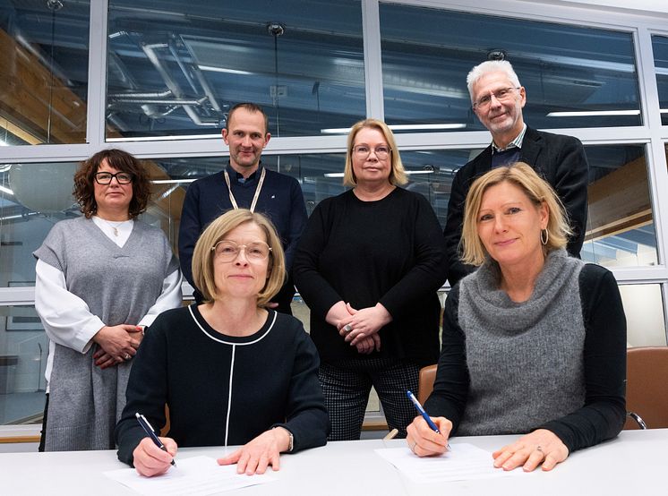 Pernilla Hellberg, projektledare Luleå tekniska universitet, Karl Karlström projektchef på Akademiska Hus, Maria Lundgren, universitetsdirektör vid Luleå tekniska universitet, Lennart Ilke, ombud vid Luleå tekniska universitet, Birgitta Bergvall-Kåreborn, rektor vid Luleå tekniska universitet och Caroline Arehult, vd på Akademiska Hus.
