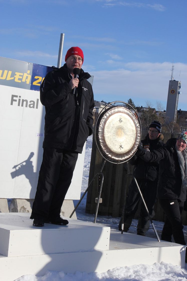 Johan Sterte, rektor vid Luleå tekniska universitet inviger årets upplaga av Yukigassen, en organiserat snöbollskrig med ursprung i Japan.