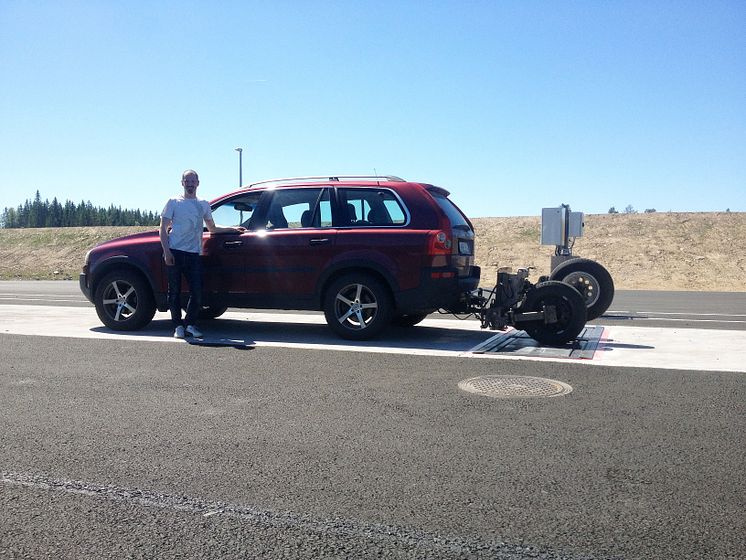 Johan Casselgren fordonsforskare vid Luleå tekniska universitet fick köra på den nya testbanan utanför Borås.