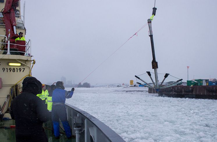 Ishåv som mäter tjocklek och vikt testas av forskarna vid Luleå tekniska universitet från akterdäck på bogserbåten Viscaria i Luleå hamn.