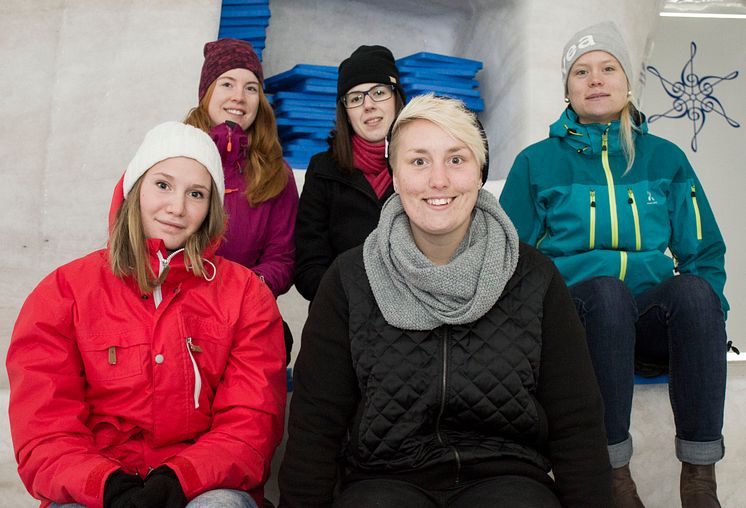 Studenterna från Luleå tekniska universitet Hanna Westergren, Ella Järlehag, Karolina Spets Granvik, Malin Hägg och Lotta Silfver är med vid akustikmätningarna i Ice Music's iskonserthall i Luleå