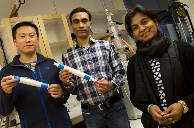 Aji Mathew biträdande professor vid Luleå tekniska universitet med sina doktorander Peng Liu och Zoheb Karim med prototyper av nanofilter.