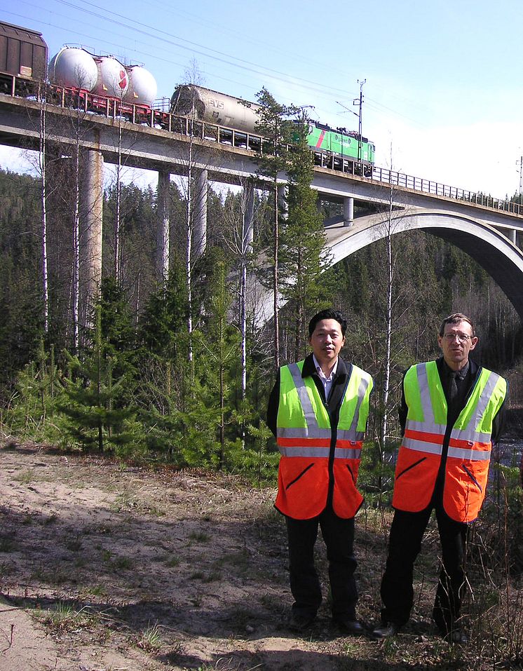 Bro över Vindelälven i Västerbotten och i förgrunden forskarna