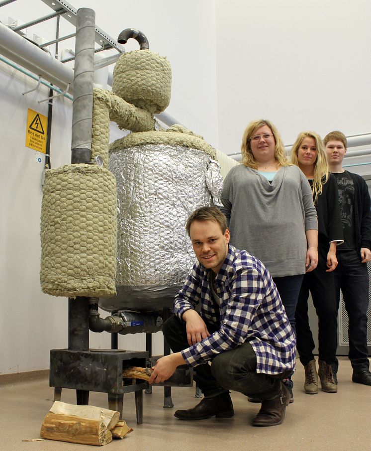 LTU-studenterna visar sitt värmesystem. I förgrunden Johan Stenvall med Ida Johansson, Annelie Nyqvist och Joakim Forsberg i bakgrunden