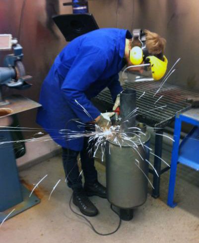 En hel del konstruktionsarbete ingick i LTU-studenternas värmelösning för utvecklingsländer. Här svetsar en av projektets studenter, Alfred Wikner, det värmekäl som ingår i värmesystemet.