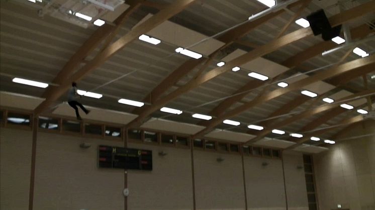 En mänsklig slunga i en gymnastiksal skickar iväg en student upp i taket, som dramatiskt tappar taget och dunsar i golvet från hög höjd. Eller en annan variant där man med slungans kraft skickar iväg studenten som slår upp ett stort hål i gymnastiksalens vägg och försvinner ut i intet. Det synliga resultatet av studentens arbete, som sträckte sig över 5 månader, har till sist blivit en reklamfilm i Tv3 för mediautbildningarna vid Luleå tekniska universitet.