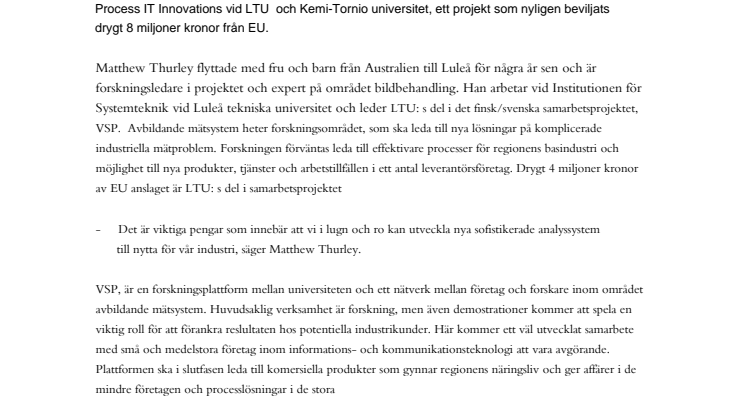 Såväl basindustri som små och medelstora företag i regionen gynnas av projektet VSP Vision Systems Research Platform, på Luleå tekniska universitet LTU. Det är ett samarbete mellan Process IT Innovations vid LTU och Kemi-Tornio universitet, ett projekt som nyligen beviljats drygt 8 miljoner kronor från EU.