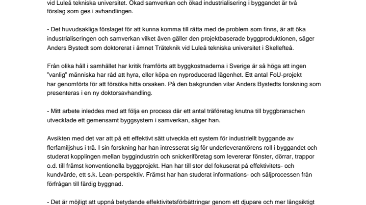 - Det huvudsakliga förslaget för att kunna komma till rätta med de problem som finns, är att öka industrialiseringen och samverkan vilket även gäller den projektbaserade byggproduktionen, säger Anders Bystedt som doktorerat i ämnet Träteknik vid Luleå tekniska universitet i Skellefteå.