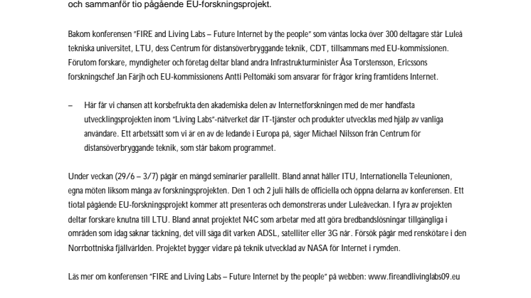 Bakom konferensen "FIRE and Living Labs - Future Internet by the people" som väntas locka över 300 deltagare står Luleå tekniska universitet, LTU, dess Centrum för distansöverbryggande teknik, CDT, tillsammans med EU-kommissionen. Förutom forskare, myndigheter och företag deltar bland andra infrastrukturminister Åsa Torstensson, Ericssons forskningschef Jan Färjh och EU-kommissionens Antti Peltomäki som ansvarar för frågor kring framtidens Internet. - Här får vi chansen att korsbefrukta den akademiska delen av Internetforskningen med de mer handfasta utvecklingsprojekten inom "Living Labs"-nätverket där IT-tjänster och produkter utvecklas med hjälp av vanliga användare. Ett arbetssätt som vi är en av de ledande i Europa på, säger Michael Nilsson från Centrum för distansöverbryggande teknik, som står bakom programmet. Under veckan (29/6 - 3/7) pågår en mängd seminarier parallellt. Bland annat håller ITU, Internationella Teleunionen, egna möten liksom många av forskningsprojekten. Den 1 och 2 juli hålls de officiella och öppna delarna av konferensen. Ett tiotal pågående EU-forskningsprojekt kommer att presenteras och demonstreras under Luleåveckan. I fyra av projekten deltar forskare knutna till LTU. Bland annat projektet N4C som arbetar med att göra bredbandslösningar tillgängliga i områden som idag saknar täckning, det vill säga dit varken ADSL, satelliter eller 3G når. Försök pågår med renskötare i den norrbottniska fjällvärlden. Projektet bygger vidare på teknik utvecklad av NASA för Internet i rymden. Läs mer om konferensen "FIRE and Living Labs - Future Internet by the people" på webben: www.fireandlivinglabs09.eu Upplysningar: Michael Nilsson, Centrum för distansöverbryggande teknik Tel 070 - 288 45 20, e-post michael.nilsson@cdt.ltu.se