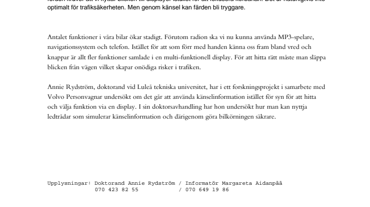 Annie Rydström, doktorand vid Luleå tekniska universitet har, i ett forskningsprojekt i samarbete med Volvo Personvagnar, undersökt om det går att använda känselinformation istället för syn för att hitta och välja funktion via en display. I sin doktorsavhandling har hon undersökt hur man kan nyttja ledtrådar som simulerar känselinformation och därigenom göra bilkörningen säkrare.