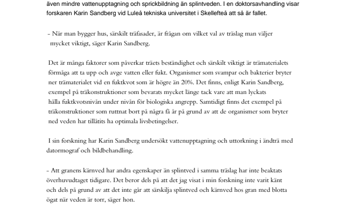 - Att granens kärnved har andra egenskaper än splintved i samma träslag har inte beaktats överhuvudtaget tidigare. Det beror dels på att det jag visat i min forskning inte varit känt och dels på grund av att det inte går att särskilja splintved och kärnved hos gran med blotta ögat när veden är torr, säger hon.