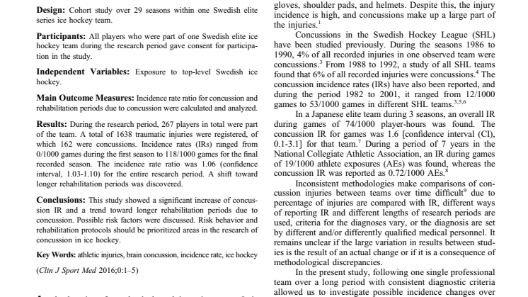 Mascha Pauelsen, doktorand i fysioterapi, och Yelverton Tegner, professor i idrottsmedicin och mångårig lagläkare för elitlag i ishockey, basket och fotboll, har studerat antalet hjärnskakningar bland spelare i ett svenskt elitlag i ishockey under 29 säsonger i följd, från 1984/85 till 2012/13.