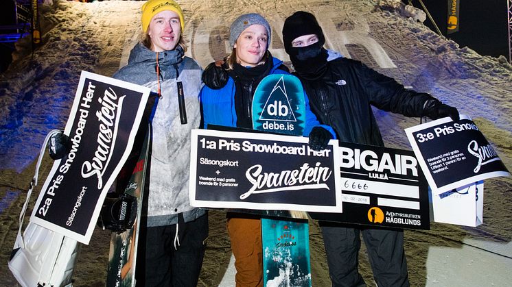 I snowboardklassen kammade Isarr Edwinds från Island hem segern och i den för i år nya studentklassen hejade publiken fram vinnaren Louie Ekepi, som gjorde en imponerande double back flip. Kuura Koivisto från Finland fick pris för årets Sickbird – det sjukaste trickset under kvällen.