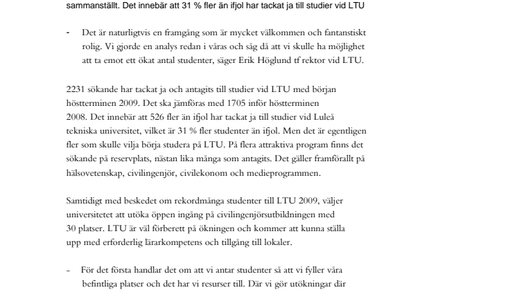 2231 sökande har tackat ja och antagits till studier vid LTU med början höstterminen 2009. Det ska jämföras med 1705 inför höstterminen 2008. Det innebär att 526 fler än ifjol har tackat ja till studier vid Luleå tekniska universitet, vilket är 31 % fler studenter än ifjol. Men det är egentligen fler som skulle vilja börja studera på LTU. På flera attraktiva program finns det sökande på reservplats, nästan lika många som antagits. Det gäller framförallt hälsovetenskap, civilingenjör, civilekonom och medieprogrammen.
