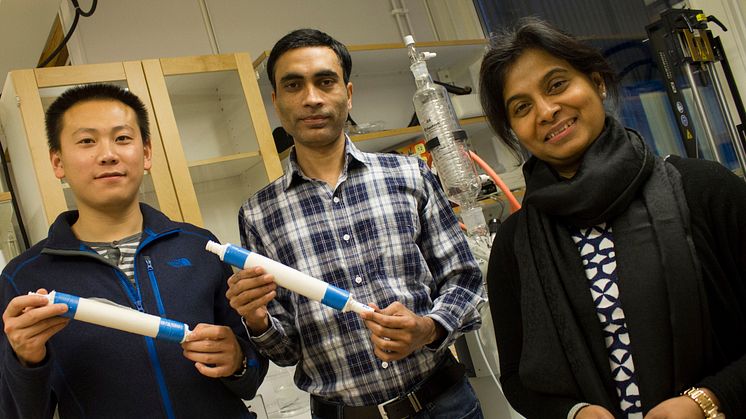 doktorander Peng Liu och Zoheb Karim med prototyper av nanofilter.