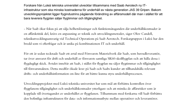 Forskare från Luleå tekniska universitet utvecklar tillsammans med Saab Aerotech ny IT- infrastruktur som ska minska kostnaderna för underhåll av nästa generation JAS 39 Gripen. Bakom utvecklingsprojektet ligger flygindustrins pågående förändring av affärsmodell där man i stället för att bara leverera flygplan säljer flygtimmar och tillgänglighet.
