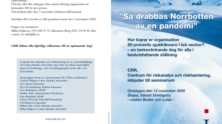 Hur drabbas socialtjänst, media, elförsörjning och basindustri när hälften av personalen är sjukskriven i två veckor? CRR - Centrum för riskanalys och riskhantering - vid Luleå tekniska universitet, arrangerar den 12 november ett seminarium om hur en världsomfattande epidemi skulle kunna slå mot Norrbotten. Målgruppen är beslutsfattare i offentlig och privat verksamhet.