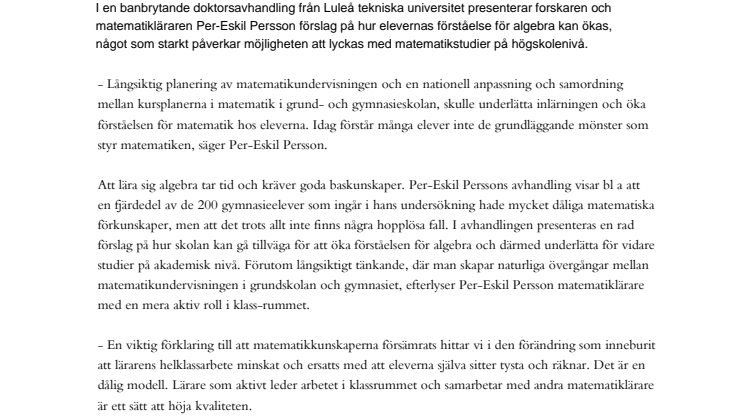 Per-Eskil Persson föreslår att algebra införs redan i grundskolans tidiga år. Han betonar även vikten av ge lärare möjlighet till kontinuerlig kompetensutveckling. Per-Eskil Persson har publicerat en rad vetenskapliga och populärvetenskapliga artiklar i svenska och internationella tidskrifter. Hans doktorsavhandlingsarbete har utförts inom ramen för den sk Luleåmodellen. Avhandlingen förväntas få betydelse för arbetet med att för-bättra algebraundervisningen och kan utgöra underlag för kommande reformer av matematik-undervisningen i det svenska skolsystemet. Per-Eskil Persson arbetar idag som lärarutbildare på Malmö Högskola.