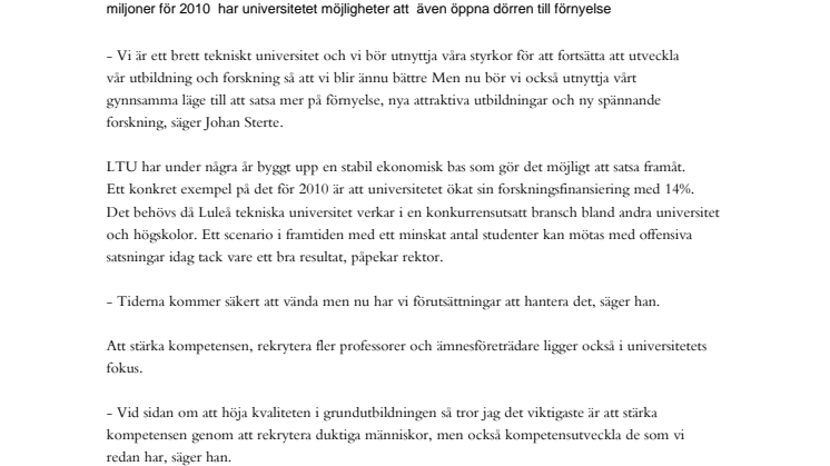 LTU har under några år byggt upp en stabil ekonomisk bas som gör det möjligt att satsa framåt. Ett konkret exempel på det för 2010 är att universitetet ökat sin forskningsfinansiering med 14%. Det behövs då Luleå tekniska universitet verkar i en konkurrensutsatt bransch bland andra universitet och högskolor. Ett scenario i framtiden med ett minskat antal studenter kan mötas med offensiva satsningar idag tack vare ett bra resultat, påpekar rektor.