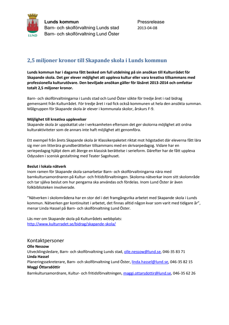 Lunds kommun har i dagarna fått besked om full utdelning på sin ansökan till Kulturrådet för Skapande skola. Det ger elever möjlighet att uppleva kultur eller vara kreativa tillsammans med professionella kulturutövare. Den beviljade ansökan gäller för läsåret 2013-2014 och omfattar totalt 2,5 miljoner kronor.