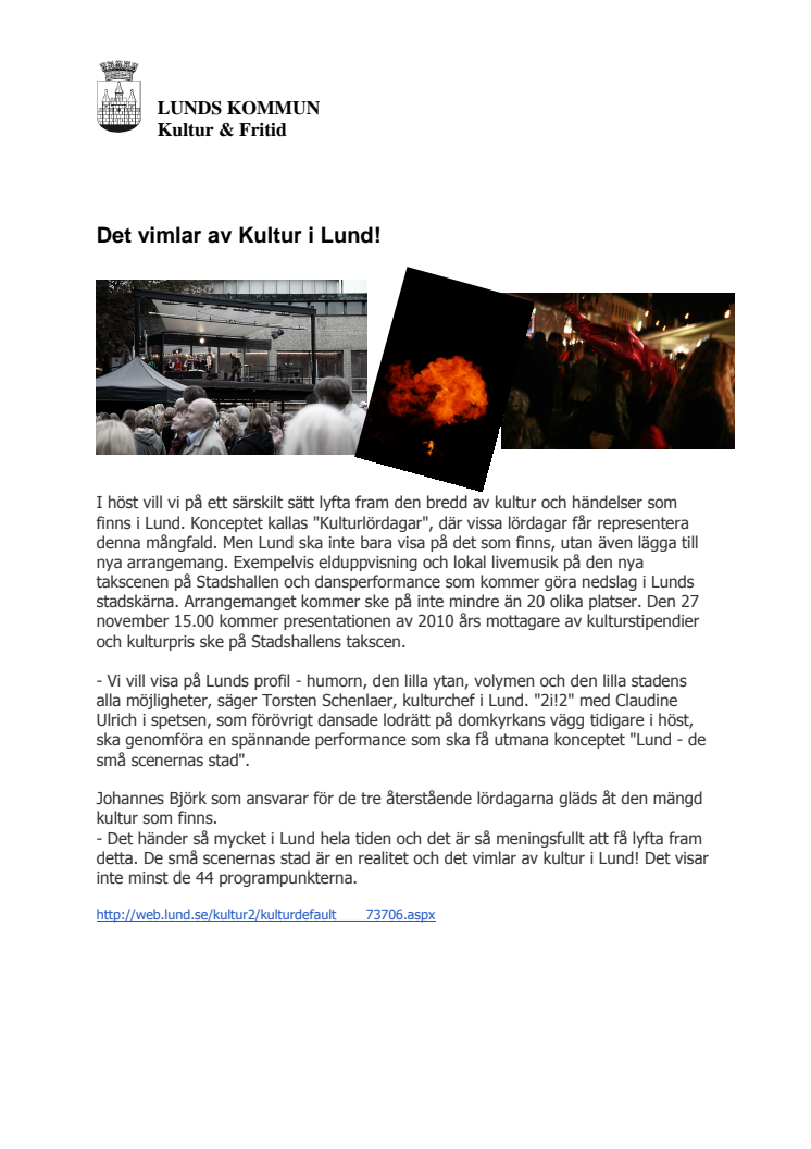 I höst vill Lund på ett särskilt sätt lyfta fram den bredd av kultur och händelser som finns. Konceptet kallas "Kulturlördagar" och använder sig av hela stadskärnan samt den nya takscenen på Stadshallen där man den 27 november 15.00 kommer presentatera 2010 års mottagare av kulturstipendier och kulturpris.
