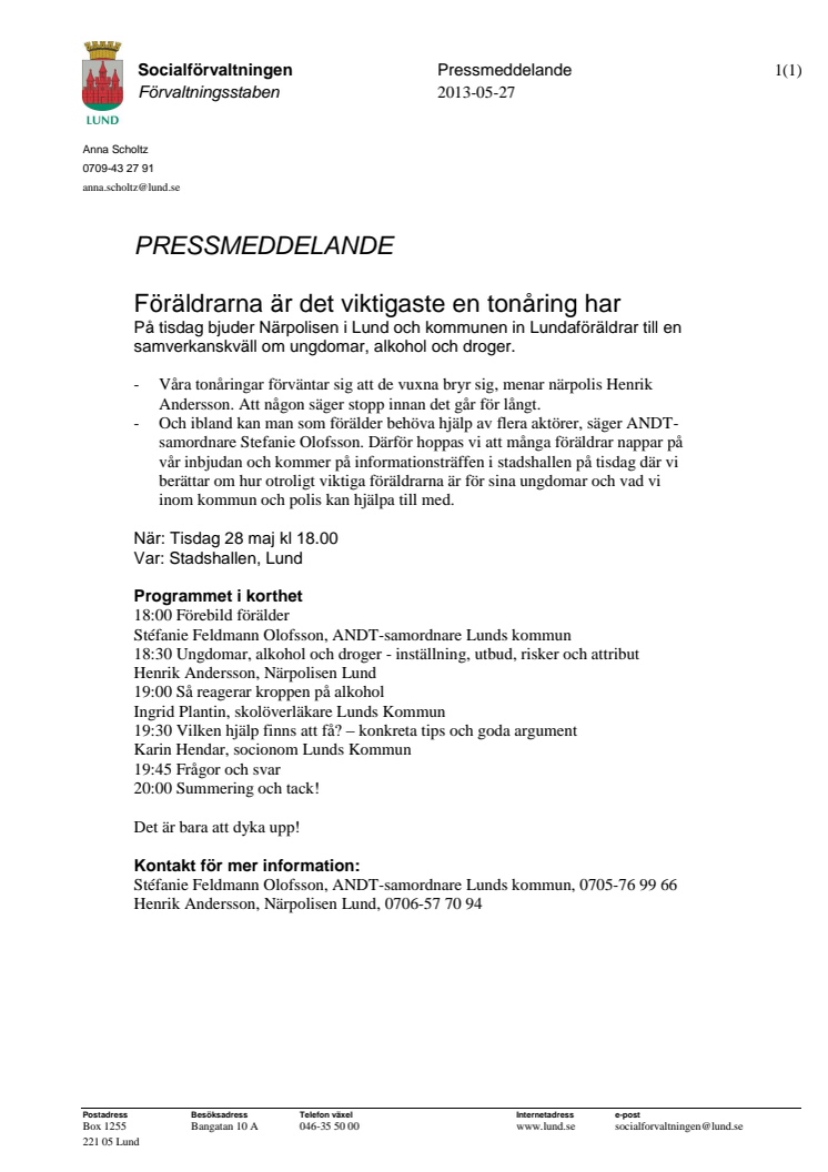 Imorgon tisdag bjuder Lunds kommun tillsammans med Närpolisen i Lund in Lundaföräldrar till en samverkanskväll om ungdomar, alkohol och droger.
