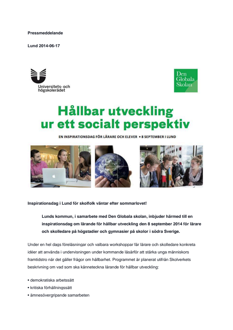 Lunds kommun, i samarbete med Den Globala skolan, inbjuder till en inspirationsdag om lärande för hållbar utveckling den 8 september 2014 för lärare och skolledare på högstadier och gymnasier på skolor i södra Sverige.