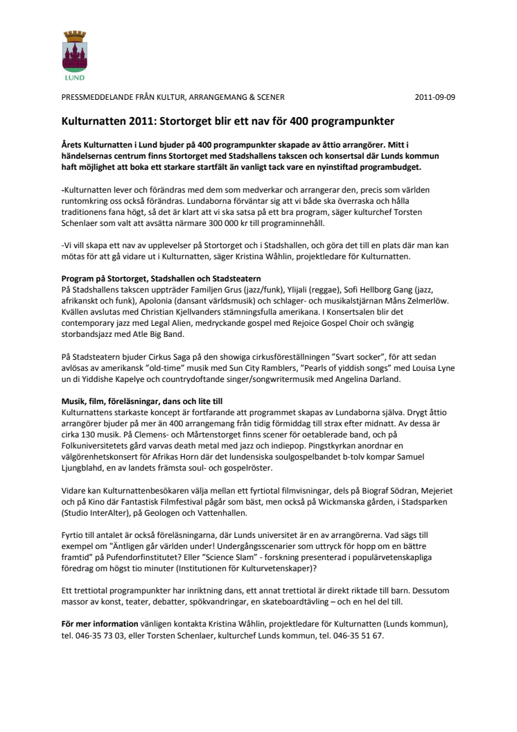 Årets Kulturnatten i Lund bjuder på 400 programpunkter skapade av åttio arrangörer. Mitt i händelsernas centrum finns Stortorget med Stadshallens takscen och konsertsal där Lunds kommun haft möjlighet att boka ett starkare startfält än vanligt tack vare en nyinstiftad programbudget.