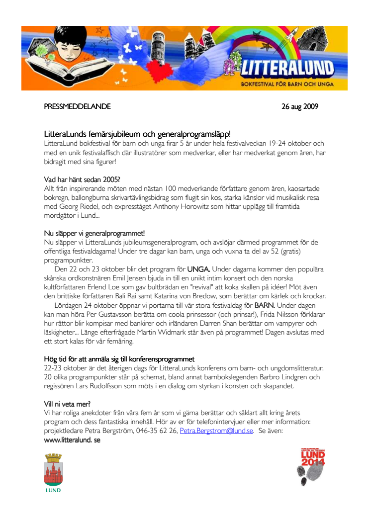 LitteraLund bokfestival för barn och unga firar 5 år under hela festivalveckan 19-24 oktober och med en unik festivalaffisch där illustratörer som medverkar, eller har medverkat genom åren, har bidragit med sina figurer. Nu släpper vi generalprogrammet! Se hemsidan eller kontakta projektledare Petra Bergström för mer information.