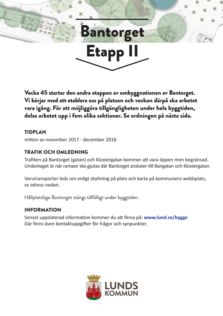 På måndag 20 november etablerar sig ett nytt anläggningsprojekt i Lund. Ombyggnationen av Bantorget är en satsning med mer än en målsättning; dels kommer Bantorget att lyftas som stadens entré till stadskärnan från Lund C, dels ska ombyggnationen vara ett bidrag till stadslivet i centrum.