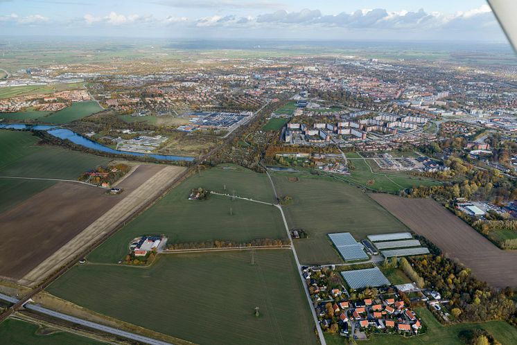 Flygbild som visar Lund sydvästra. Delar av området är objekt för arkitekttävlingen Europan där unga europeiska arkitekter ska lämna förslag på hur området ska utvecklas. Förslagen kommer att integreras i det större utvecklingsarbetet för sydvästra Lund där bland annat en fördjupad översiktsplan tas fram.