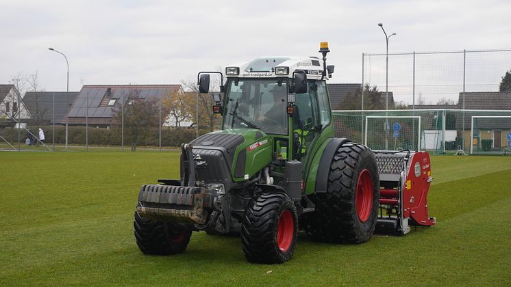 Gräsplanen perforeras för att få skapa hålrum som sedan fylls med biokol.