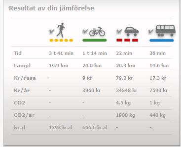 Lunds kommun har utvecklat Resejämföraren, en webbtjänst som jämför olika resval utifrån kostnad, tid, hälsoeffekter och miljöpåverkan.
