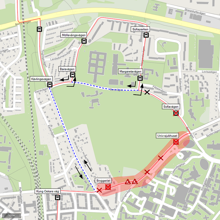 Universitetssjukhuset, temporär resväg för busslinje 3.